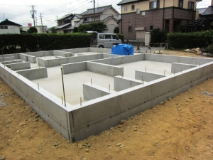 傾斜地等の特段の条件がなければ、2度打ちのベタ基礎を標準採用しています。基礎は鉄筋コンクリート(規定に基づいて組んだ鉄筋をコンクリートで被覆します。)鉄筋とコンクリートのそぞれの材料短所を補います。
